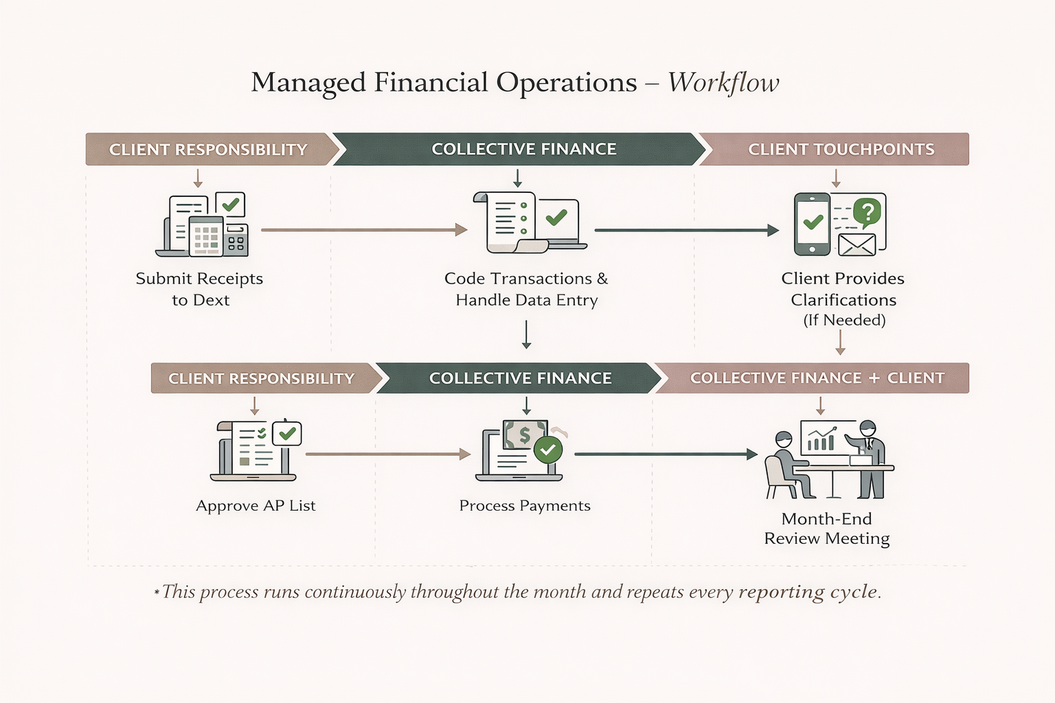 Our process follows a predictable monthly rhythm designed to reduce risk and eliminate last-minute scrambles.
