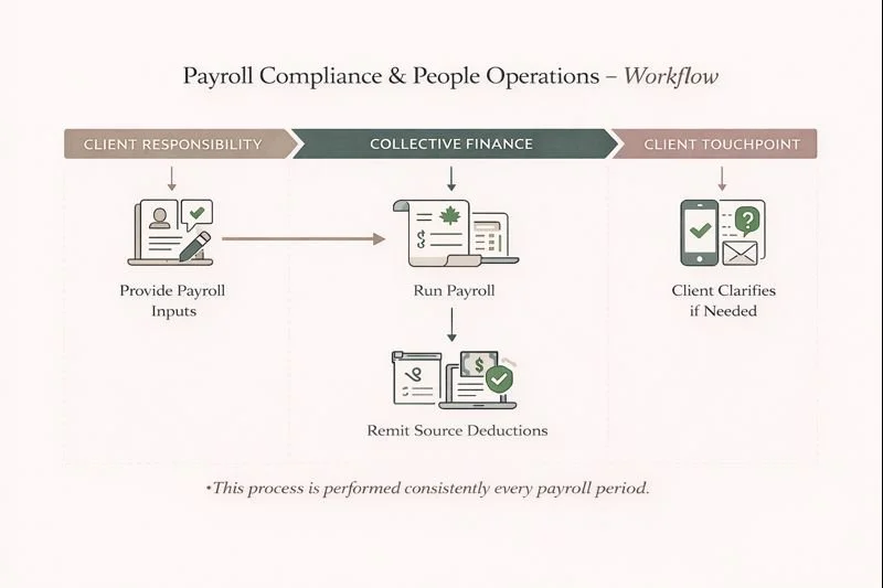 Collective Finance provides payroll support for Canadian businesses and non-profits that need payroll processed accurately, remitted correctly, and documented properly every cycle.